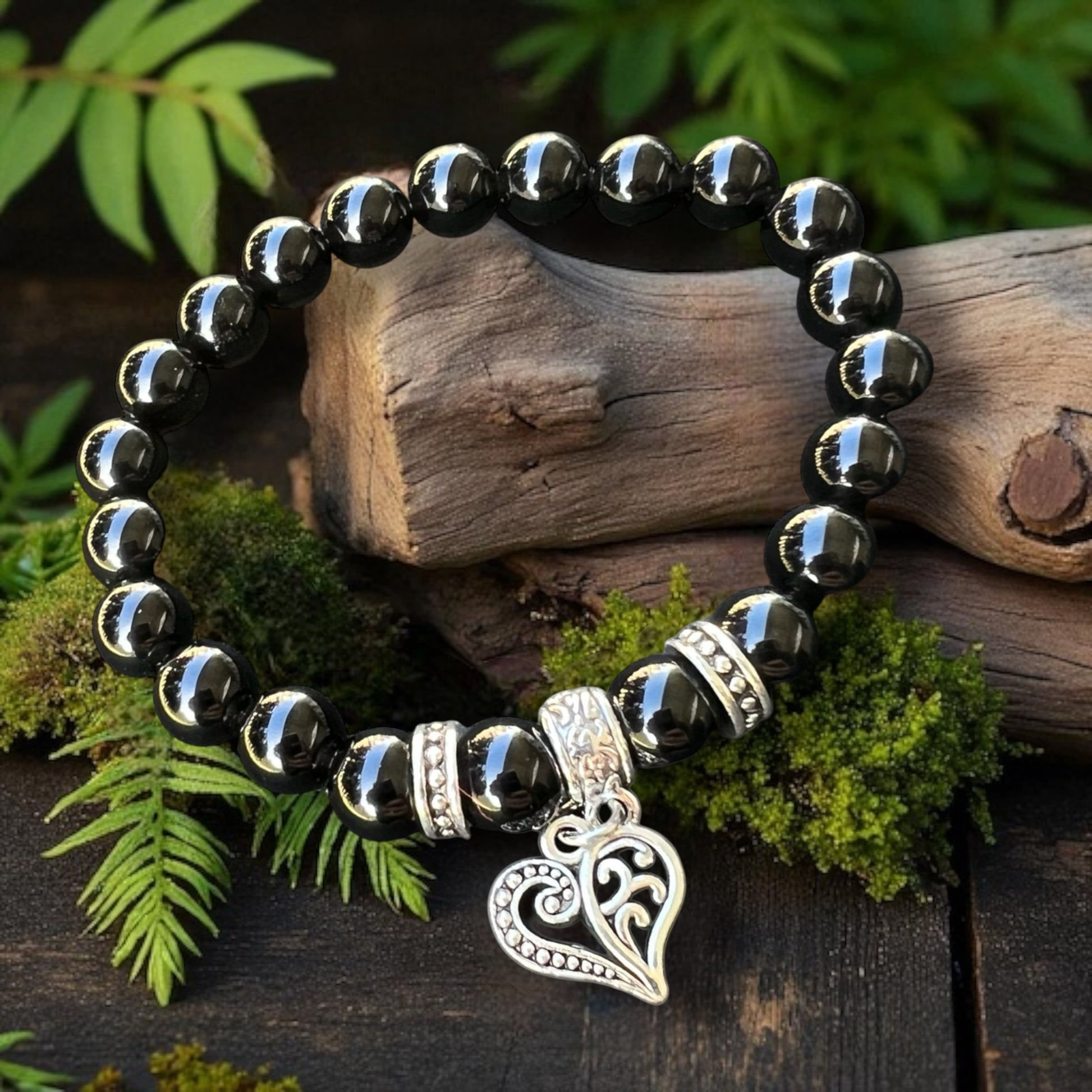 BLACK OBSIDIAN BRACELET WITH FILIGREE HEART