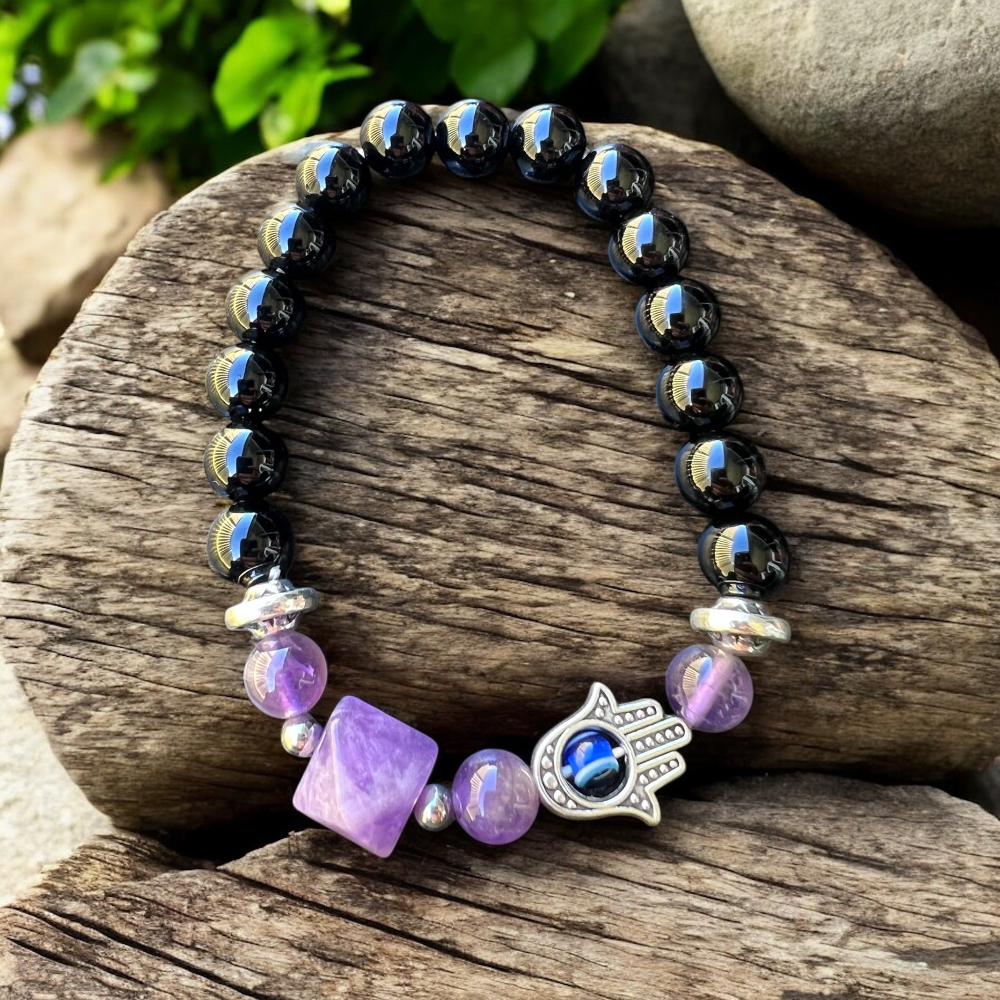 TOURMALINE & AMETHYST BRACELET WITH HAMSA HAND CHARM.