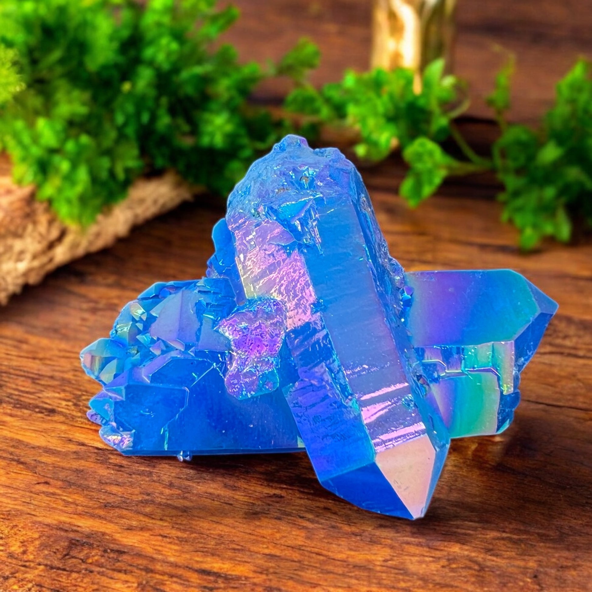 This Blue Aura Quartz cluster combines the high-vibrational clarity of Quartz with a shimmering metallic coating, creating a radiant stone that elevates communication, spiritual awareness, and emotional expression. The iridescent blue finish is created by bonding Quartz with precious metals, enhancing its energy and giving it a luminous, otherworldly sheen.