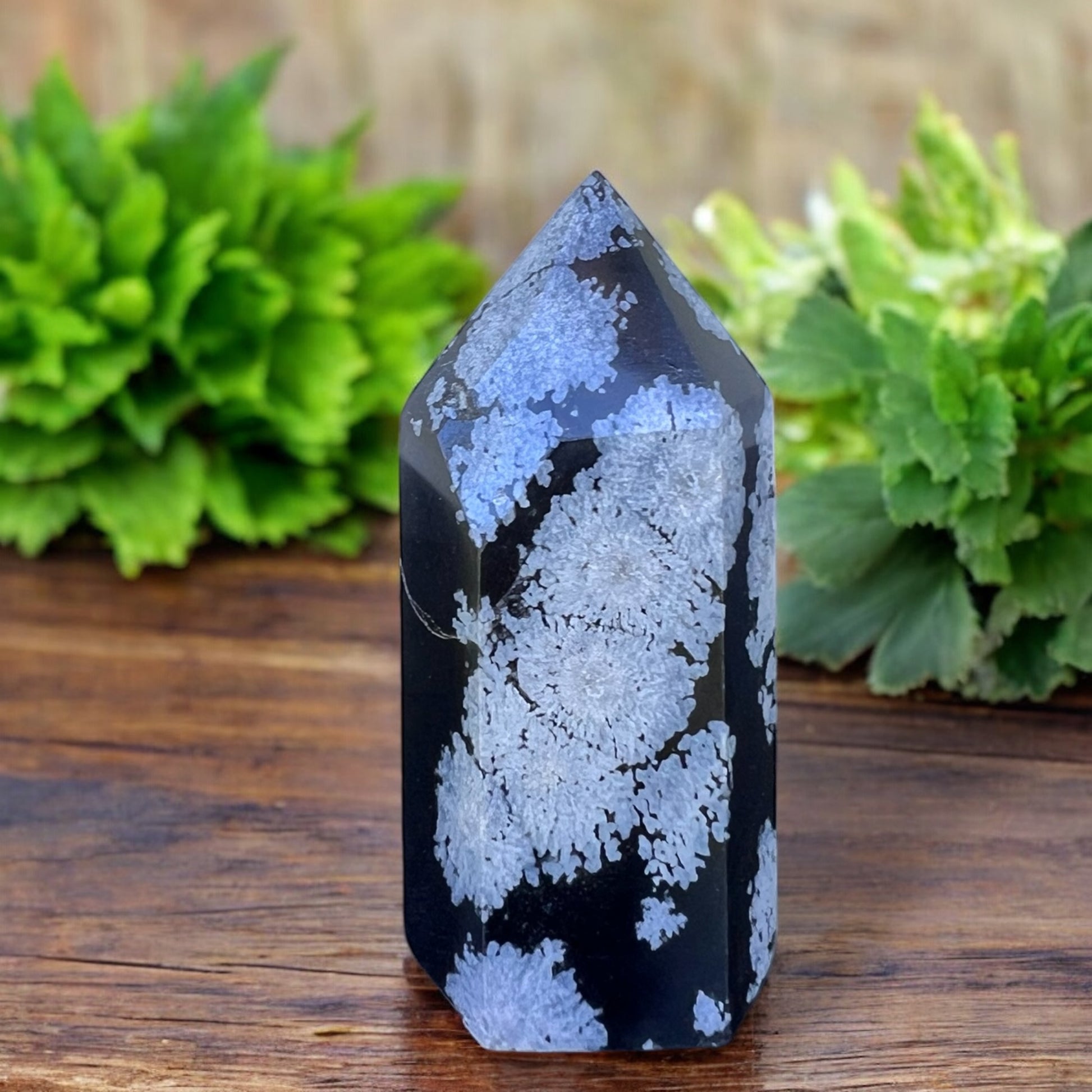 This Snowflake Obsidian generator carries the grounding power of volcanic glass softened by delicate grey-white inclusions that resemble falling snow. A stone of balance and inner truth, it helps you recognise patterns, release negativity, and find calm in times of change. The generator point amplifies and directs its energy upward, making it a powerful tool for transformation, meditation, and energetic protection.